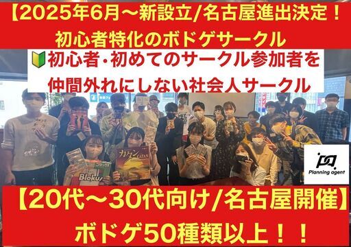 【20代〜30代向け/初心者特化/イベントボックス最大級のボードゲームサークル】名古屋のレンタルスペースを貸し切って開催するボードゲーム企画です。初参加の方でも安心できるよう、フォロー体制を万全に整えています。今回も、皆さんにとって楽しいひとときになるよう、心を込めて準備しています。なかなかない特別企画ですので、ぜひご参加ください。 ■集合・実施場所愛知県名古屋市中村区竹橋町5-5 さかえビル2F-C(名古屋No135)JR中央本線「名古屋駅」徒歩3分※途中参加・途中退出も可能です◾️開催頻度月に2回前後◾️参加費1500円〜2000円(予約したプランによる) ■Plannning agentとは?東京を拠点に活動している20代〜30代向けの社会人サークルです。活動ジャンルは、ボードゲーム・Switch・カメラ・ダーツ・サバゲー・交流会・ポケカ・鬼ごっこ・学校貸切イベントなど多岐にわたり、友達づくりや趣味のきっかけづくりを行っています。東京・大阪・福岡で展開しており、今回新たに名古屋支部を立ち上げました。 ■名古屋開催の背景過去に東京のイベントへ名古屋や京都から参加された方々より、「名古屋でもこういうサークルがあったら」という声をいただきました。距離的な理由で開催を見送っていましたが、ついに名古屋開催を決意。名古屋にも、趣味・友達・コミュニティを気軽に楽しめる場を作っていきます。 ■私たちが目指すもの私たちは、イベントを通して「居場所」をつくることを目的としています。社会人になると友人関係が限られ、休日が職場以外と疎遠になることも。代表自身も同じような経験をし、思い切ってサークルを立ち上げました。いまでは参加者同士で友達になり、趣味を共有しながら充実した休日を過ごす人も増えています。 ■イベント内容名古屋のレンタルスペースにて、4〜6人のテーブルを複数設置し、席替えをしながらさまざまなゲームを楽しみます。 ■フォロー体制についてゲームのルールがわからない時はスタッフがサポートします。慣れずに輪に入りづらい時も、代表やスタッフがフォローしますので安心してご参加ください。※困った時は遠慮なく声をかけてください。 ■ゲームの難易度すべて初心者向けの簡単なボードゲームをご用意しています。これから始めたい方や、興味本位で参加したい方に最適です。重めのゲームを好む方にはやや物足りないかもしれません。 ■持ち物・参加費(必須)・カードゲーム・ボードゲーム(任意)・飲み物(持ち込み可)※自作ゲームはご遠慮ください※譲り合いができない方は参加をお断りしています ■ボードゲームの数初心者向けを中心に、約50種類のボードゲームをご用意しています。 ■禁止事項(必ずお読みください)・アムウェイ、マルチ商法、営業行為、宗教・団体への勧誘、引き抜き、ナンパ、暴言などは禁止です・一度会った後の営業・勧誘行為もNGです・運営の指示に従えない方、迷惑行為があった場合は出入り禁止とします・他団体の代表・主催者の方は、受付時に必ず申告してください(無断での参加は発覚次第、厳正に対応) ■参加方法ジモティーからお問合せください