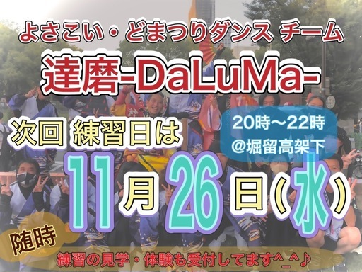 本投稿をご覧いただきありがとうございます✨ 令和に発足しましたよさこい・どまつりチーム「達磨-DaLuMa-」と申します😄私たちのチームは現在、名古屋にて毎年8月&11月に開催される「にっぽんど真ん中祭り(通称: どまつり)」に向けて練習活動に励んでおり、舞台で一緒に踊るメンバーを大募集中です😄ですが、皆さんにチームに気軽に触れていただきたく下記日程にてチーム練習の体験会を実施しております💡🕺チーム練習 体験会概要💃🗓️日時@2025年11月26日(水)20時〜22時※ご都合に合わせてお気軽にご相談ください😄📍場所@堀留高架下(ミニスポーツ広場)※地下鉄 矢場町駅(3番出口)から徒歩5分程度のキング観光🎰が目の前にある高速道路下の空き地で行います。※雨天時も同じ場所で開催します😄👜持ち物@運動できる格好👕👖👟、飲み物、タオル、レジャーシート(あると便利)、楽しむ心(←コレ必須w)※年齢・経験など問わず見学・体験のご希望 の方は大歓迎です😄※基本的な情報のため、事前のお問合せにて必ずご確認・ご申請の上でご来場下さい💡※ 「達磨 どまつり」でネット検索いただければ演舞動画などの情報も出てきますので、是非チェックしてみて下さい💡⬇️のような事を求めている方は是非✨「お祭りが好き」「盛り上げることが好き」「踊ってみたい」「身体を動かす習慣を作りたい」「仲間と共に一つの事で感動を作り上げたい」「絆で結束された仲間・友人を作りたい」等々ご経験問わず、性別も年齢も国籍も一切不問です💡幅広い交流が出来るのも私たちチームの魅力の一つです😄チームメンバーの大半が踊り初めてで入って、今では楽しく踊っておりますので、みんなで支え合い丁寧に教えて行きますのでご安心してお越し下さい😄ご興味を持ってくださった方は、まずはお問い合わせ✉️ください😊お話だけ聞いてみたい、というのも大丈夫ですよ👌是非、よろしくお願いします😄※ 人としてのモラル・マナーが守れない方はご対応致しかねますのでご了承下さい。※ 当活動の趣旨に沿わない勧誘・引き抜き・他コミュへの誘導などは厳禁としております。