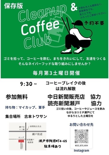 5/17(土)9:30〜 場所: 瀬戸市陶原町 ヨリミチ瀬戸 古本トワサンにて、Cleanup Coffee Club (略してCCC)を開催します。ゴミ拾いをしてから、みんなでコーヒーなど(無料)を飲みながらワイワイおしゃべりして懇親する集まりです。雨天(小雨)でも開催する予定です。本日は雨のため、CC(Cleanupなし)にしますが、開催はします。ご参加お待ちしています。