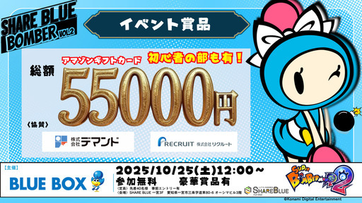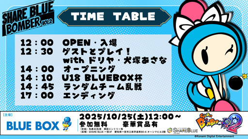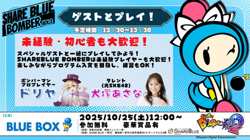 残り7枠募集中!大好評につきエントリー増枠も決定!!若干数空きを用意できましたのでこちらから✉️🩵🩵エントリーフォーム https://forms.gle/wgHqmzafFQxvXeT49🎮 一宮市のeスポーツ施設で第二回開催! 初回は満員御礼ありがとうございました! 🔥 熱いバトルが繰り広げられる「ボンバーマン大会」を開催します! 💎 豪華賞品あり!初心者・親子・友達同士の参加も大歓迎!ゲストには元SKE48,タレントの『犬塚あさな』さん、ボンバーマンプロプレイヤーの『ドリヤ』さん、全日本eスポーツ実況王決定戦ファイナリストの『yokazeP』さん未経験の方でもご参加いただけますので、皆様のご来場をお待ちしております!※事前エントリー必要、定員有・先着順でのご案内となります。 ご希望の方はお早目にお願いします※エントリーフォーム https://forms.gle/wgHqmzafFQxvXeT49イベントHP https://share-blue.com/news/?p=491てぶらで来ていただいて大丈夫です🎮