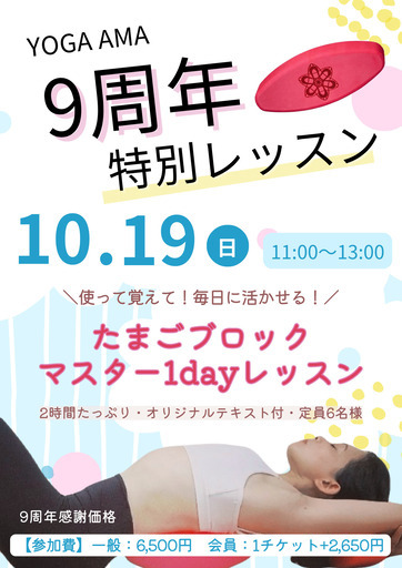 地下鉄本郷駅2番出口から徒歩20秒の少人数制ヨガスタジオ「YOGA AMA」です。皆様に支えられて、2025年10月で9周年を迎えることができます。感謝の気持ちを込めて【9周年特別WS】を開催します。1度経験したらやめられない。使った人は皆欲しくなるたまごブロック。そんなたまごブロックを使ったたまごヨガは、いつものヨガよりしっかりゆるんでリラックス。あまりの気持ちよさに皆たまごブロックを購入されるけど、お家でちゃんと使えてる?オブジェになったりしていないですか?そんなたまごブロックの使い方を、オリジナルテキストを使いながら学んで覚えて、生活に活かせる2時間です。◆参加費(税込)一般 6,500円 会員 回数券、マンスリー1回+2,650円◆持ち物・動きやすい服装でお越しください。(更衣室もございます) ・水分補給用のお飲物 (スタジオでも世界トップクラスのシリカ含有天然水を販売しております)・汗拭き用のタオルや手ぬぐい◆開場時間・15分前からの入室が可能です ・遅れて来られた場合は、ご入室をお断りすることがございますのでご了承ください。◆キャンセル待ちのお客様へ・キャンセル待ち枠でご予約頂き、空きがでましたらキャンセル待ちして頂いている皆様全員にメールでお知らせさせて頂きます。