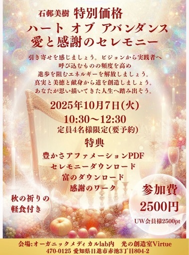 🌸イベント案内🌸ハート オブ アバンダンス愛と感謝のセレモニー秋の実りの季節に合わせて、愛と感謝のエネルギーを深め、潜在意識を豊かさへと書き換える特別な時間をお届けします。当日はアバンダンスの天使をお招きし、カードを通してメッセージを受け取りながら、宇宙からの実りのエネルギーを感じていきましょう✨⸻📅 日時:2025年10月7日(火) 10:30〜12:30📍 場所:オーガニックメディカルlab内 光の創造室Virtue(愛知県日進市赤池3丁目804-2/赤池駅から徒歩3分)👥 定員:4名様限定(要予約)💰 参加費:2,500円(UW会員様:2500pt)🌟当日の流れ(予定) 1. オープニング祈り秋の季節に合わせた「実りの祈り」で心を整えます。 2. 潜在意識の書き換えワーク愛・感謝・豊かさの周波数を受け取り、潜在意識に新しいコードを刻みます。 3. アバンダンスの天使とカードメッセージ天使の導きのもと、それぞれが必要な気づきを受け取ります。 4. 豊かさアファメーション作成自分自身に合った言葉を見つけ、日常で使えるお守り言葉としてお持ち帰りいただけます。 5. ティータイム(秋の祈りの軽食付き)宇宙の実りを感じながら、分かち合いの時間を楽しみましょう。⸻🎁 ご参加特典 • 豊かさアファメーションPDF • セレモニーダウンロード(エネルギーワーク) • 富のダウンロード • 感謝のワークシート • 秋の祈りの軽食付き⸻✨「なんとなく気になる…」そんな直感からのご参加も大歓迎です。愛と感謝を通して、人生にさらなる豊かさを呼び込みたい方におすすめのセレモニーです🌸統合していきましょう。空きがありますので、お気軽にご参加ください☆