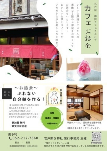 信州安曇野にある岩戸開き神社⛩️ 名古屋樂行事務局主催✨ YouTube フォロワー10万人越え での樂行で 『丹田の秘密 』 https://www.youtube.com/watch?v=d8A_1Qv9ws4&t=112s 自分のこと好きですか? はい!ってすぐにいえますか?(*^^*) なぜ 言えないのか 考えたことはありますか? 自分らしく生きるための 自分にとって必要な軸ってなに? いらないものは何? 見極めていくには自分のことをよく知ることがとても大切です‼ café交流会では 自分の人生 自分がなぜそうなるのか、 これからどうしていきたいのか 気づいていただけるように 楽しみながら ご案内しています❣ ✨こんな方に おすすめです✨ ・自分軸をしっかり立てたい! ・より良くし可能性を開いていきたい! ・自分は何をしたいのかよくわからないを解決! そして ・自分の傾向をよく知りたい! ・人生をより良くしたい! ・問題解決の力をつけたい! ・振り回されるのはもう嫌! ・人間関係に悩んでいる! などなど 日頃の忙しさから離れて 少し懐かしさを感じる古民家風のスペースで美味しいスイーツなどをいただきながら 自分を見つめる 大変貴重な時間となります✨ どなたでもお気軽にご参加ください。 ※とても気になるけど 日時が合わないなど ございましたら この日程以外も対応は可能です。 お気軽にご希望日時をお問い合わせ下さい(*^^*) 日時 :10月 8日(水) 15:00 ~ 場所 :甘味や 澤田商店 すてきな古民家風の空間のお店です 名古屋市中区栄1丁目13-31 連絡先:052-212-7860 (担当:長屋) 参加費:1000円(ドリンクや甘味などは 各自で別途お支払いお願いいたします。) お気軽になんでもお問い合わせください。