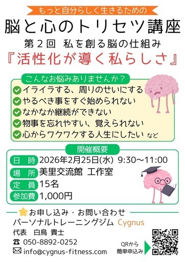 もっと自分らしく生きたいあなたへ「脳の仕組み」を知って、行動力・継続力・感情のコントロールを高めませんか?第2回のテーマは『活性化が導く私らしさ』脳の仕組みを知り、心と行動を前向きに変えるヒントをお伝えします😊【開催概要】📅 2026年2月25日(水)9:30〜11:00📍 美里交流館 工作室👥 定員15名💰 参加費 1,000円申し込みはコチラ↓ https://forms.gle/qBju4qDe1h32FXGb8