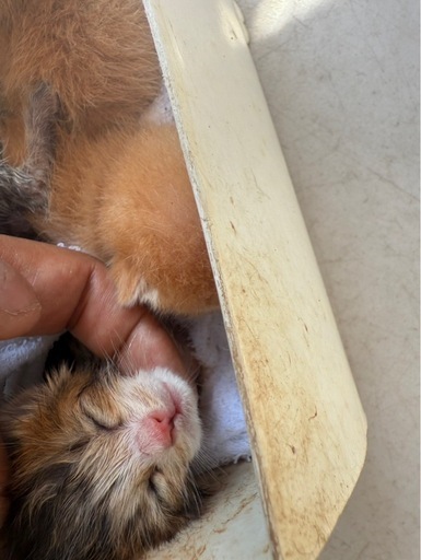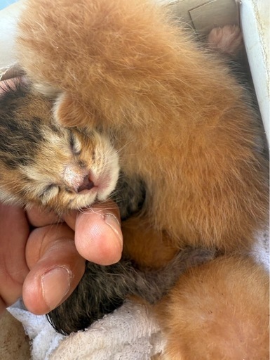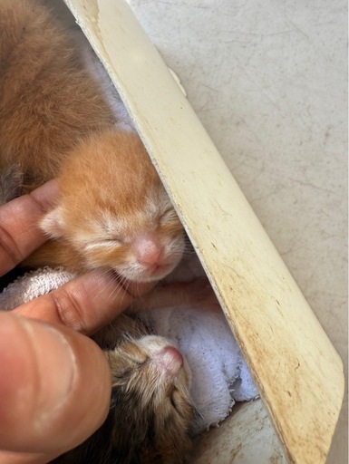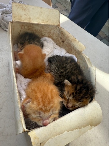 ◆性格や特徴子猫漁港に捨てられてました。生後数日だと思います。母猫もいなくてこの写真のように置いてありました。性別もわかりません。◆健康状態3匹は元気ですが1匹が少し危ない状況なので病院へ4匹とも連れてきます。産まれて数時間でミルクを少し飲ませたら元気になってきました。◆その他