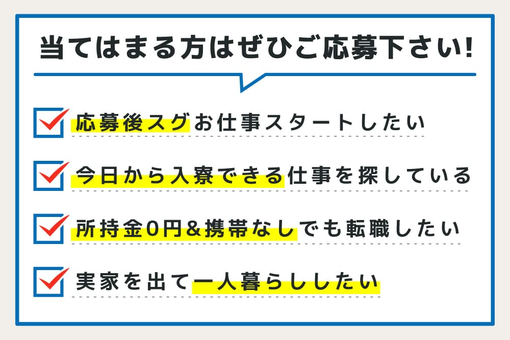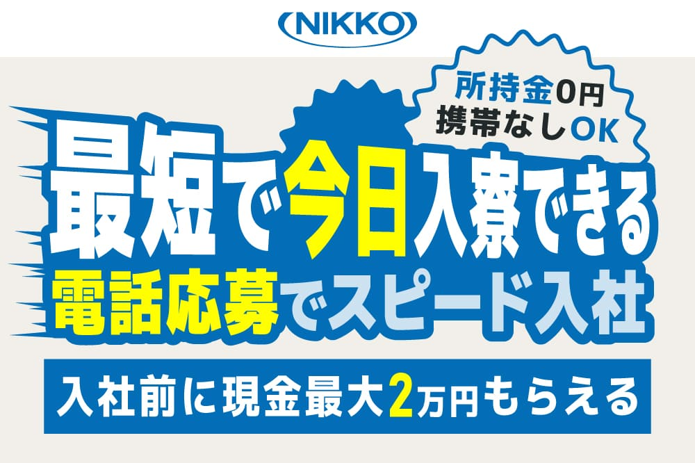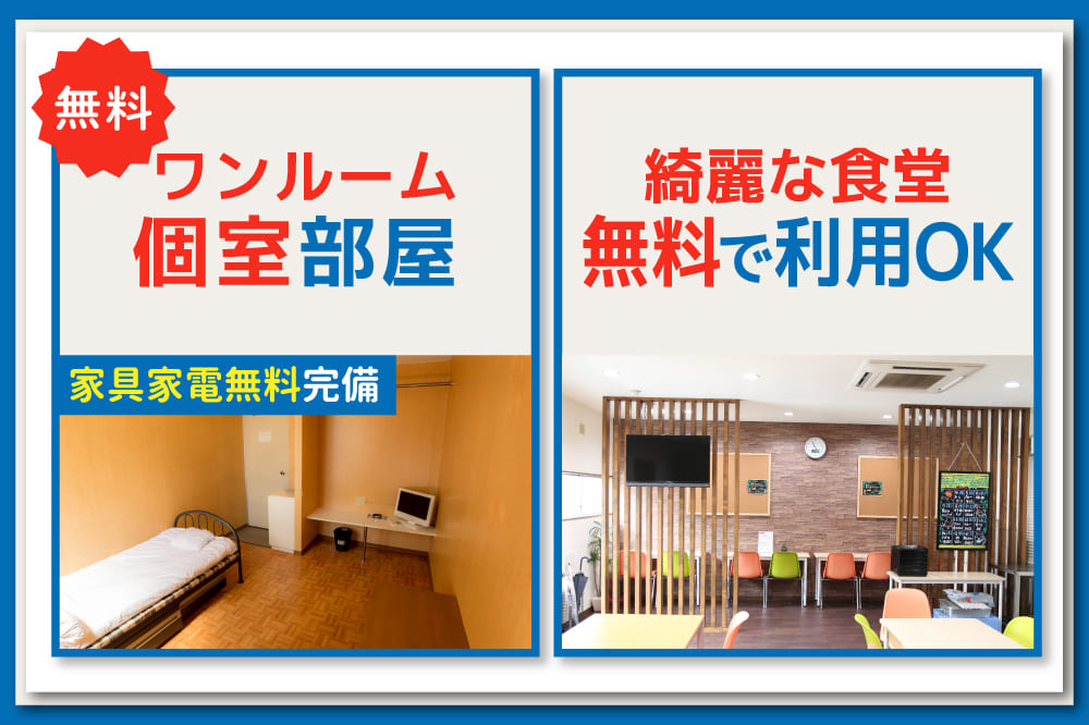 寮有/即入寮/未経験OK/大量募集/送迎有/友達と働く/土日休み/格安寮/車通勤OK/特典有/社員登用有/月収30万円以上/寮費無料/1R/2DK/食堂付き寮/家具家電付き寮