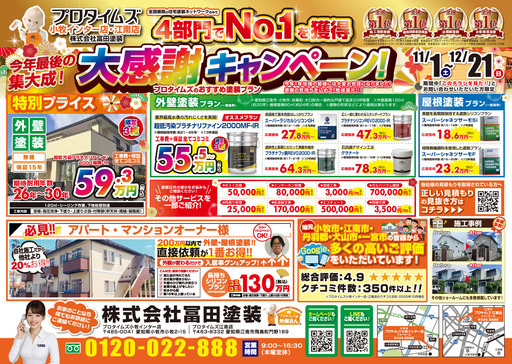 外壁・屋根塗装をご検討中の方へ✨今年ラストのビッグキャンペーン開催中!【キャンペーン期間】2025年11月1日(土)〜12月21日(日) まで◇✨限定3棟だけの特別価格プラン✨◇🎨 超低汚染プラチナリファイン2000無機-IR→ 59.3万円(税込)(超高耐候グレード/15年保証付き)🎨 超低汚染プラチナリファイン2000MF-IR→ 税込 55.5万円〜(当店人気No.1のおすすめプラン)※どちらも【限定3棟のみ】の早い者勝ち!◇ご成約W特典(先着5名様限定)◇① 塗料代 → 0円!② 足場代 → 0円!🎁見積り・来店特典もご用意🎁・見積り特典:ギフトカード 3,000円分・来店特典:QUOカード 1,000円分※お見積りだけのご依頼も大歓迎です!🛠 小工事のご相談もOK!・ポスト交換・雨漏り補修・ガルバリウム施工・網戸張替え・雨樋交換 など地域密着で安心の施工店✨他社では真似できない【W工事保証】&【4回塗り】で、長持ち・高品質な仕上がりをお約束します!今年最後のお得な機会です。まずはお気軽にお問い合わせください😊