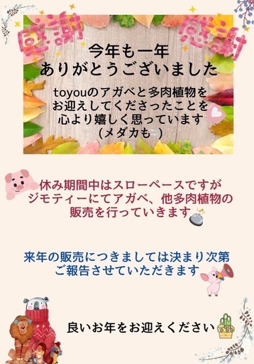 ジモティで、多肉植物やアガベの販売を始めた1年でした皆様に見ていただき、ご購入していただき、感謝の1年となりました新たに皆様に喜んで頂ける商品を紹介していきますので、今後とも宜しくお願いいたします🙇♀️🙇♂️来年の店舗販売は春先からとなりますが、それまでの間ジモティではピックアップ販売をしていきますInstagramやLINEでは告知はありませんのでジモティも見て頂ければと思います2026年もどうぞ宜しくお願いいたします良いお年をお迎えください🤗