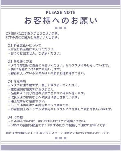 約30種類のメダカを無人販売してます。旬なメダカや珍しいメダカがお手頃な価格となっています!●場所愛知県常滑市天竺57-4(メセナライフ敷地内)●日時毎週土日 11:00~17:00●販売品種(予定品種)緑光、緑光ヒレ長、緑光鋼、黒百式、レックウザ、三色体外光、三色エンペラー、菊銀紅玉、朱光菊、ゴア、エールルージュ、デーンモルフォイエローtype、桜餅、草餅、ユリシス、ベテルギウス、ルミナ、夜桜風雅、サファイア、サファイア松井ヒレ長、白斑サファイア、ピンクサファイア、ピンクオーロララメ、さくら、宮桜、宮美、狼牙、KAGLA、令和ヒミツヘイキRLF、東天光フレアー、紅華、初恋、天使の雫、ポニョ、レモンスカッシュ、天女、蕾華、雫、玉椿、深海、和墨三色、和墨白銀、令和白ブチWF、北辻墨虎、銀閣、オセロ、オランジェ、曜変天目、青星河、クラウドグレーダイヤ、龍の瞳、ドラゴンジェイスペード、MDS乱舞パーシモンコブラアースアイetc.成長したメダカから順次販売予定です!●価格200円/匹~●販売方法・ボトルに入ったメダカはフタをしてそのままお持ち帰り下さい。・ケースに入っているメダカはお客様ですくって頂き袋にいれてお持ち帰り下さい。・料金は料金箱にお入れ下さい。(お釣りはありませんご了承下さい)●駐車場・店舗前に駐車下さい。・路上駐車はご遠慮下さい。●SNSX : https://x.com/tasu_medakaInstagram : https://www.instagram.com/tasu_medaka/#めだか