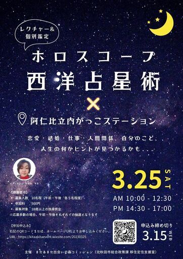 占星術師によるホロスコープについてのレクチャーと個別鑑定会を開催します♪西洋占星術におけるホロスコープとは、天体の配置図のことで、生まれた瞬間の星の配置で占うものです。誕生の瞬間にどの方向に位置していたかが把握できれば、その人の性格や運気がわかるというもので、これらの情報をもとに将来の動向まで予測できるとされています。ホロスコープには、自分の特性や得意なこと、不得意なこと、また、人生の目的、人生でいつどんなことが起きるかなどの情報が多く含まれています。自分がどのような星のもとに生まれたかを知り、自分らしく、前向きに生きるためのヒントを探してみませんか。※占いは、エンターテーメントコンテンツであり、あくまでも参考程度とするものです。最終的に決断を下し、現実を作り出すのは自分自身の行動であることに留意してください。【開催日時】2023年3月25日(土) 午前、午後の2回(午前の部)10:00~12:30(午後の部)14:30~17:00【開催場所】阿仁比立内がっこステーション(秋田内陸線比立内駅駅舎内)【イベント】午前の部(午後の部)10:00~(14:30~)ホロスコープのレクチャー11:00~(15:30~)個別鑑定(一人15分程度) 個別鑑定後、随時解散【参加費】 500円(茶菓子付き)【参加対象】 18歳以上の独身男女【募集人員】 午前の部、午後の部、各5名程度【申込締切】 2023年3月15日(水)※参加の決定は3月17日までにお申し込みのメールアドレスにお知らせします。【申込方法】 イベントの詳細とお申し込みは、専用のホームページをご覧ください。 (URL) https://kitaakitaevent.wixsite.com/20230325