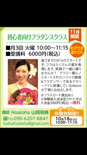 初心者歓迎♬ お子様連れok♬みなさまゼロからのスタートです。フラダンスやってみたい方♡運動不足解消に♡お友達づくりに♡癒しに♡一緒に楽しく踊りましょう!⭐︎無料体験会日 H28.10月18日 火曜日 am10〜11:15 ⭐︎場所 南行徳駅徒歩5分 m-ing(エミング) 市川市相之川3-2-13 明光企画ビル3階レンタルスタジオ H28.11月よりフラダンスクラスが新しくオープン!月3回 火曜日 am10:00〜11:15 (随時体験無料)無料体験要予約お気軽にお問い合わせください。090-6207-8847huihuihoaloha@gmail.comHoaloha 山岡