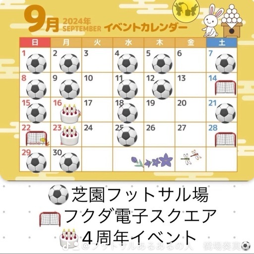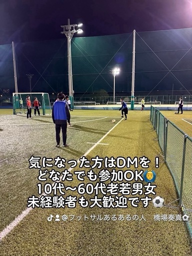 フットサルサークルの「ラポール(rapports)」です!頻度は週3〜4回ペースで開催してます😆人数は毎回20名前後集まります! 練習等は無く、チームに分かれてひたすらゲームをします! みんなで楽しくワイワイをモットーに活動してますので ガチでやりたい方は物足りないかもしれません! サッカーやフットサル経験者の方は女性や未経験の方に配慮できる方でお願いします! 20代〜40代中心となりますが10代の学生さんから60代の方まで幅広い年齢層の方がいらっしゃいます(^ ^) フットサルを楽しみたい方であれば男性・女性 経験・未経験一切問いません。 個サルだと常連さんの輪があって入りづらい、1人では行きづらいってそんな方にはオススメ、みんなフレンドリーで楽しく遊んでいます!TikTok、Instagram、YouTubeで動画をあげてますので「フットサルあるあるの人 橋場奏真」で検索してみてください🤗 ↓詳細は以下の通りです↓ チーム参加、サークル参加、友達同士の参加大歓迎‼️9月スケジュール⚽️9/30(月)19:00〜21:00芝園フットサルA10月スケジュール⚽️10/2(水)19:00〜21:00芝園フットサルC⚽️10/3(木)19:00〜21:00芝園フットサルC🥅10/6(日)19:00〜21:00フクダ電子スクエア ソサイチ⚽️10/7(月)19:00〜21:00芝園フットサルC⚽️10/9(水)19:00〜21:00芝園フットサルC⚽️10/10(木)19:00〜21:00芝園フットサルA⚽️10/12(土)11:00〜13:00芝園フットサルC※時間注意⚠️⚽️10/13(日)17:00〜19:00芝園フットサルA※時間注意⚠️⚽️10/14(月)11:00〜13:00芝園フットサルA※時間注意⚠️⚽️10/16(水)19:00〜21:00芝園フットサルC⚽️10/17(木)19:00〜21:00芝園フットサルB⚽️10/19(土)11:00〜13:00芝園フットサルA※時間注意⚠️🥅10/20(日)19:00〜21:00フクダ電子スクエア ソサイチ⚽️10/21(月)19:00〜21:00芝園フットサルC⚽️10/23(水)19:00〜21:00芝園フットサルC⚽️10/24(木)19:00〜21:00芝園フットサルB⚽️10/27(日)17:00〜19:00芝園フットサルC※時間注意⚠️⚽️10/28(月)19:00〜21:00芝園フットサルC⚽️10/30(水)19:00〜21:00芝園フットサルC⚽️10/31(木)19:00〜21:00芝園フットサルB⚽コート詳細️🥅芝園テニスコート・フットサル場(幕張豊砂駅)千葉県習志野市芝園1丁目3番2号(習志野市芝園公園内)チップ入り人工芝参加費300円 定員24名フクダ電子フットサル 参加費500円 定員24名フクダ電子ソサイチ 参加費800円 定員24名フクダ電子フルコート 参加費500円 定員30名千葉市 中央区川崎町1-20(蘇我駅)※ロングパイル人工芝 スパイク可カテゴリー 男女ミックス集まったメンバーでひたすらゲームを回します‼️強シュート、激しいタックル、スライディング禁止*サッカー、フットサル経験者の方は女性や初心者の方には特に優しくお願いします