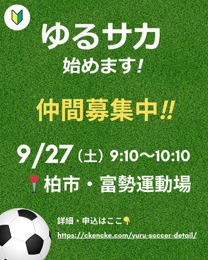 ご覧いただきありがとうございます! 柏市・流山市エリアで、初心者向けのサッカーサークル「ゆるサカ」を立ち上げました⚽ ※2025/9/27(土) 初開催!!◆活動の特徴 ・サッカー経験や体力は問いません。そもそも主催が技術も体力もありません。・運動不足解消や下手でもめっちゃ楽しそうにサッカーをするような場にしたい。・コーチはいませんが、簡単なメニュー(パスやシュート練習)とミニゲームで楽しく運動したいと思っています。 ◆活動場所 柏市 富勢運動場など(柏市の運動場を借りれた場所で開催) ◆活動日時 月2~4回程度、土曜の9:10~10:10を予定(朝早くの1時間。週末の時間を奪わないことが続けられることにつながると思っています)◆参加費 1回 1000円(現金払い:現地にて)◆持ち物持ち物:運動できる服装、飲み物、運動靴※ボール、ビブス、マーカーなどは主催にて用意いたします。◆こんな方におすすめ! ・運動不足を解消したい ・ダイエットのきっかけが欲しい ・同年代の仲間と楽しく体を動かしたい ・サッカーが好きだけど本格的にはやる自信がない ◆お申込み・お問い合わせ まずはお気軽にご連絡ください😊ゆるサカの詳細についてお伝えします!一緒に「ゆるく楽しく」ボールを蹴りましょう!