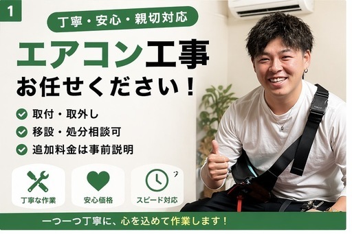 はじめまして! エアコンの取付・取り外し・移設を対応しています。「丁寧・安心・分かりやすい対応」を大切に、 1件1件しっかり作業させていただきます。【料金目安】 ・エアコン取付(標準工事)12,000円〜 ・取り外し 5,000円〜 ・移設・処分などもご相談OK※追加料金が発生する場合は必ず事前にご説明します【対応内容】 ・新品/中古どちらも対応 ・引越しに伴う移設 ・配管延長・部材交換なども対応可能【対応エリア】 千葉・東京・埼玉(その他もご相談ください)【安心ポイント】 ・丁寧な施工 ・清潔な作業を徹底 ・作業前にしっかり説明 ・できる限りご希望に合わせます【こんな方におすすめ】 ・できるだけ安く済ませたい ・ちゃんとした人にお願いしたい ・急ぎで取り付けたいまずはお気軽にご連絡ください! 設置場所のお写真を送っていただけると、スムーズにお見積りできます。