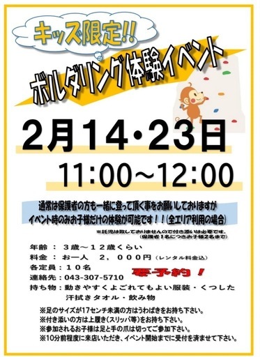 好評につき毎月開催しているキッズボルダリング体験イベントです!子供の成長に必要なあらゆる筋肉やバランス感覚を鍛えられるだけでなく、登ることを通じて考える力や想像力を育むことができます! まずはぜひお気軽にご体験下さい☆リピーターもOK! 年齢 3歳~12歳くらい(お子様と一緒に体験してみたい保護者様もOKです!) 料金 一人2000円(レンタル込) 定員 10名程度 連絡先 043-307-5710(要予約!) 持ち物 動きやすく汚れてもよい服装 靴下 タオル 飲み物(※お店の入り口に自販機もあります) 保護者の方は室内履き ※定員になり次第締め切らせていただきますのでお早目のご連絡をお待ちしております。 ※足のサイズが17cm未満の方は念の為、上履きをお持ちください。(クライミングシューズを嫌がるお子様もいる為) ※足と手の爪は切ってご参加下さい。 ※10分前位に来店いただき、時間までに受付を済ませてください。 ※無料駐車場4台有り。満車の場合は近隣コインパーキングをご利用下さい。 ※ご予約は営業時間内にお願い致します。 ボルダリングジム登攀道場 ・営業時間 月〜金 17:30~22:00、土 13:00~20:00、日・祝 13:00~18:00詳細はスタッフまでお気軽にお問い合わせ下さい(^^)