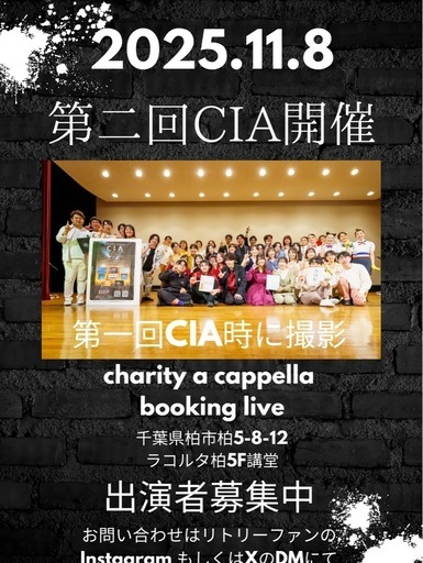 はじめまして!突然のメッセージ失礼致します。千葉県の柏市とYouTubeなどSNSを中心に活動しております社会人アカペラグループ・リトリーファンと申します。YouTubeやX、InstagramやTiktokなどのSNSでも投稿をしております。 https://youtube.com/@liedliefern?si=DjIYs6K-obA9o_ED来る2025年11月8日(土)私達は千葉県柏市ラコルタ柏講堂にてアカペラグループによるブッキング・チャリティーライブ《第二回CIA》を開催致します。※「CIA=千葉で 一緒に アカペラを」の頭文字になっております。現在リトリーファンではこちらのイベントに参加して頂ける出演者を募集中です!出場者の皆様のエントリーはこちらから可能となっております。《第二回CIAエントリーフォーム》 https://forms.gle/ZEf7ibH7R8MouWs69【🎁早期エントリー特典🎁】エントリー期限は2025.10.6日となっておりますが、早期にエントリーして頂いたグループは、早期エントリー特典として出演時の映像を編集し、ライブ映像動画作品として動画データをプレゼント致します。(各組1曲ずつ3〜5分程度)エントリー時、その他ご質問等の欄に「特典希望」とご記載下さい。①今回のチャリティーイベントの趣旨アカペラ歌唱という文化活動を通して、近隣地域や他アカペラグループとの交流を図り、その文化発展に寄与すると共に、柏市の公益活動促進基金登録以下8団体(特定非営利活動法人老いじたくあんしんねっと/柏自主夜間中学/特定非営利活動法人NPOこどもすぺーす柏/柏市ひとり親(母子、父子、寡婦)福祉会/プチカル柏の葉/特定非営利活動法人 ASEAN Link/できる街プロジェクト/特定非営利活動法人赤ちゃんのほっぺ)へ収益を全額寄付し、支援の一助を担う。※各団体の名前との活動内容の詳細は下記リンクでご確認頂けます。 https://www.city.kashiwa.lg.jp/shiminkatsudo/region/shiminkatsudo/shien/2060/index.html②イベントの内容複数のアカペラグループによるブッキングライブ形式。収益は上記団体へ寄付金として全額寄付致します。(売り上げ➖経費🟰収益)出演者1人1500円(事前予約制)来場者の入場・観覧無料(任意で寄付金を募ります)12:50開場13:00開演15:40終演16:00 記念撮影、記念品授与などを行い一切終了グループメンバー数4〜6名。演奏形態はアカペラを基本とします。キーボード等の持ち込みを希望されたり、人数が6名以上になる場合は別途ご相談下さい。各グループ5〜15分枠をご用意致します。入退場及びMCなど込みの時間です。出演グループは10組前後を見込んでおります。1曲からご出演頂けます。ただし、出演料金は演奏時間によって変動せず、一律とさせて頂きます。2.3グループ掛け持ちで出場される場合は都度出演費をお支払い下さい。出演時間、演奏時間は上記の範囲で可能な限りご希望を考慮致します。出演希望者過多の場合、大変恐縮ながら選考とさせて頂きます。ライブのファイナルステージとして当日、出演者の皆様にご投票頂いて、最も投票得点の高かった上位2グループにはアンコールステージをご用意しております。(1組7分✖️2組)集計システムについては別途ご案内致します。同じ曲を演奏して頂いても結構ですし、別途アンコール曲をご用意の上、歌って頂いても構いません。③イベント参加者に伝えたいこと出演者の皆様には他グループとの交流や日頃の練習の成果を発表の場としてご活用下さい。来場者の皆様にはライブ会場でしか味わえないアカペラが持つハーモニーの魅力を存分に楽しんで頂ければと思っております。また上記文化活動を通して地域福祉活動の一助となれることを望んでいます。ご出演頂ける場合には2025年10月6日までに上記エントリーフォームへのご入力とと出演費の送金をお願い致します。また、ご不明点等ございましたらご遠慮なくお問い合わせ下さい。皆様のご出場、心よりお待ちしております。#アカペラ #出演者募集 #千葉 #チャリティー #ゴスペル #合唱 #ライブ#イベント #福祉 #YouTube #Instagram #フェス