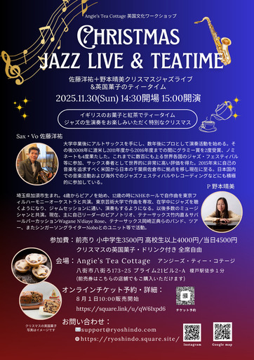 英国文化ワークショップ【佐藤洋祐+野本晴美クリスマスジャズライブ&英国菓子のティータイム】クリスマスに作られるイギリスのお菓子と紅茶を味わいながら、ジャズの生演奏をお楽しみいただく、特別なクリスマス。英国でのクリスマスの過ごし方などクリスマスのお話もさせていただきます。2025年4月に開催された「生演奏で聴くUKミュージック&英国菓子のティータイム」が大変ご好評いただき、この度リクエスト開催となりました。参加費:前売り 中学生以下3500円 高校生以上4000円/ 当日4500円 定員30名公式サイト: https://ryoshindo.square.site/紙チケット(前売券)は、Angie’s Tea Cottage(アンジーズ・ティー・コテージ) 店舗で販売しております。当日券がでない可能性があります。参加を希望される方はお早めに事前予約をお願いいたします。出演者プロフィール:【佐藤洋祐】サックス・ヴォーカル大学卒業後にアルトサックスを手にし、数年後にプロとして演奏活動を始める。その後2008年に渡米しニューヨークにて盛んに活動、特に男性ボーカリスト、グレゴリー・ポーターの5人編成バンドにおいて唯一の管楽器奏者として在籍し、彼の4枚のアルバムに参加。2011年度から2016年度までの間にグラミー賞を2度受賞、ノミネートも4度果たした。これまでに数百にも上る世界各国のジャズ・フェスティバル等に参加、サックス奏者として世界的に非常に高い評価を得た。その後2015年末に同バンドを離れ、自己の音楽を追求すべく米国から日本の千葉県佐倉市に拠点を移し現在に至る。日本国内での音楽活動および海外でのジャズフェスティバルやレコーディングなどにも積極的に参加している。サックス・フルート・クラリネットプレーヤー、シンガー、作曲家、アレンジャー、教育者。【野本晴美】ピアノ埼玉県加須市生まれ。4歳からピアノを始め、12歳のときにNHKホールで自作曲を東京フィルハーモニーオーケストラと共演。東京芸術大学で作曲を専攻、在学中にジャズを聴くようになり、ジャムセッションに通い、演奏もするようになる。以後、ギター増尾好秋、ドラム大坂昌彦、アルトサックス池田篤、ベース中村健吾、ドラムTommy Campbellらのバンド、ツアーを経て多数のミュージシャンと共演。現在、主に自己リーダーのピアノトリオ、テナーサックス竹内直&サバールパーカッションWagane N'diaye Rose、テナーサックス岡崎正典らのバンド、ツアー、またシンガーソングライターNoboとのユニット等で活動。Angie's Tea Cottage アンジーズ・ティー・コテージ 店主 【小林アンジー】1991年英国イーストサセックス留学中にクリームティーのおいしさに感銘を受け、スコーンの研究を始める。また紅茶について学び、2018年ティーコーディネーターの資格を取得。2019年千葉県八街市にリョウシンドウ菓子工房をオープン。2024年9月榎戸駅前に実店舗(テイクアウトショップ)「アンジーズ・ティー・コテージ」をオープン。こだわりのカントリースコーンが人気の英国菓子と紅茶のお店です。駐日英国大使館英国アンバサダーアワード2017「フード部門」受賞。英国アンバサダー。日英アフタヌーンティー協会認定クリームティーコーディネーター。