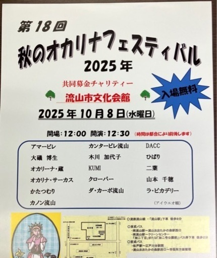 流山で恒例の 第18回 秋のオカリナフェスティバルを文化会館で開催しますお出かけ下さいますと嬉しいです日時2025年10月8日(水)開場: 12時 開演:12時30分 予定場所流山市文化会館アクセス⚫︎流鉄 流山線 流山駅下車 徒歩8分⚫︎南流山駅から 東武バス⚫︎松戸駅 or 流山おおたかの森駅から 京成バス入場無料全席自由出演オカリナ: 山田恭弘 、オカリナ愛好者ピアノ : 原田恵 、田尻洸貴 他パーカッション : 継田和広他問合せ小さな小さな音楽会事務局080-4157-1448こちらのジモティからのご連絡もOK