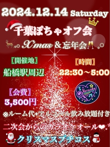 ぽっちゃり〜ミケポ女性&ぽっちゃり〜ミケポ好き男性の(*」´□`)」みなさぁ〜ん♬.*゚二次会からですが、カラオケオール❤︎.*しませんか?【日程】 12月14日(土)【開催地】 船橋駅周辺【時間】 22:30〜5:00【会費】 3,500円※ルーム代+アルコール飲み放題付き途中参加、途中退室OKデッス!(˘͈ᗨ˘͈)ノ30代〜40代の参加者サマ中心です⸜(*ˊᗜˋ*)⸝参加希望の方は…①名前(HN)②年齢③LINE交換OK or NGをメッセしてください♪*゚*⋆꒰ঌ┈12月13日(金)┈໒꒱⋆*《一次会》︎✿·͜· 男性 15名︎ꕤ︎︎·͜· ︎︎女性 11名一次会は、締切らせて頂きます(❁ᴗ͈ˬᴗ͈)沢山の参加表明&問合せありがとう⸜(*ˊᗜˋ*)⸝✼••┈┈••✼••┈┈••✼••┈┈••✼••┈┈••✼《二次会》︎︎✿·͜· 男性 9名︎ꕤ︎︎·͜· 女性 6名二次会は、まだ募集してます٩(ˊᗜˋ*)و”一次会からの流れの方もいらっしゃいますが、二次会からの参戦者サマもいらっしゃいますので、お気軽に参加表明お待ちしてます❤︎.*LINE交換NGの方は、ココでのやり取りになります!!よろしくお願いいたします❤︎.*