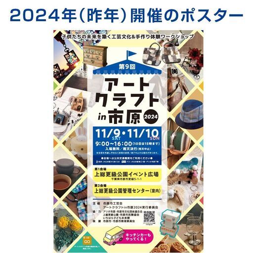 第10回 アートクラフトin市原出店者募集中!!2025年11月8日・9日★出店者募集のお知らせ★◎出店ブース数 110店舗◎全国のクラフト作家が集合◎物販、物販+ワークショップ◎3.6×3.6mのゆったりブース◎ブース前まで車の乗り入れ可能「工芸」「ものづくり」の楽しみを子供達へ発信し、未来へと「工芸」の素晴らしさを繋ぎたい。作品・作家作り手と多くの人使い手との出会いを提供します。+++++++++++募集内容+++++++++++2025年11月8日(土)・9日(日)9:00〜16:00(9日は15:00まで)開催地:上総更級公園イベント広場 (千葉県市原市更級5-5-1)出店料:¥12,000(3.6×3.6mブース 100区画) ¥7,000(1.8×1.8mブース 初出店の方のみ・10区画)募集期間:2025年1月26日 〜 2025年2月28日まで〈一次募集〉出店条件:①プロの個人作家、及びそれに準ずる方 ②2日間出店できる方 ③展示・販売は出店者本人の手作り作品に限る ※その他 開催概要、注意事項を一読ください。 ※作品レベルが規定に満たない場合出店をお断りする場合もあります。申込方法:HPにある開催概要、注意事項を一読いただき専用フォームよりご応募ください。++++++++++++++++++++++++++++アートクラフトin市原 webサイト https://artcraft-ichihara.amebaownd.com/+++++++++++++++++++++++++++++主 催:アートクラフトin市原実行委員協 力:市原市工芸会、市原市文化団体連合会事務局:アートクラフトin市原実行委員会