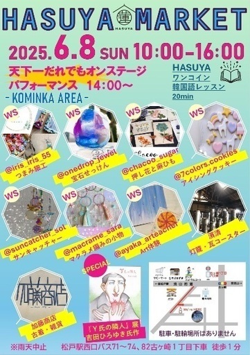 Hasuya Market vol.4// early summer//早めの夏 ハスヤマーケット開催日時>>6月8日 (日曜日)10:00〜16:00※雨天中止ハスヤマーケットのvol.3 early summerが6月8日に開催されます。暑いけど楽しい夏が近づいてきますが、その前にハスヤマーケットでワイワイしませんか?今回はワークショップが多く開催されるのでご家族でお友達で又はお一人でのご参加でも楽しい時間になること間違いなしです🤭またハスヤマーケットでは初のタロット占いや流行の耳ツボジュエリーが出店します。日頃の心の悩み、体の悩み!スッキリできるかもです😆そして天下一だれでもオンステージ!これもまた初の企画です。自分の特技を披露できる舞台!現在ダンスと楽器演奏を披露する方々が集まっております。是非ご覧下さい。そしてそして素敵なハンドメイド作家さん達も集まっております。作家さん達の手作り品、どこにもない好みの一点物探してみてください。また"美味しい"もあります。どれも美味しい人気のキッチンカー、アトリエ・ニハクさんと焼きたて食パン専門店、一本堂さんが出店です。ある日曜日の楽しいイベントになるよう出店者一同頑張ります。皆様のご来場お待ちします。◆場所→住所: 松戸市古ヶ崎2-3247→徒歩なら: 松戸駅西口からガスト古ヶ崎店を目印に来てください。ガスト古ヶ崎店と青木内科の間道に入って真直ぐ100mくらいです。当日看板が出ます。→バスなら: 松戸駅西口バス71〜74、82番で古ヶ崎1丁目で下車。反対側にある青木内科とガスト古ヶ崎店の間道に入って下さい。◆駐車、駐輪場はありません。❥❥❥❥ワークショップ案内❥❥❥❥♠アイシングクッキーのワークショップは完全予約制になります。ご予約は7colors.cookie@gmail.comまで又はDM→@7colors.cookies♠ART体験オイルパステルワークショップは予約制、空きがあれば当日受付可能です。ご予約は https://forms.gle/PupV3K4sX89gPtzg6又はDM→@ayaka_arteacher♠つまみ細工ワークショップは予約制、空きがあれば当日受付可能です。ご予約はDM→@iris_iris_55♠イヤーカフのワークショップは予約制、空きがあれば当日受付可能です。ご予約はDM→@lalalan_yuko♠他のワークショップは当日受付です。❥❥天下一だれでもオンステージの時間案内❥❥14時から特技披露スタートします。是非ご覧下さい🫰🏻❥❥❥❥出店リスト❥❥❥❥☆物販☆@etouminoie /絵とレジン雑貨@kotakotashop /アクセサリー雑貨@patsupako /テラコッタグッズ@otenkishama /ビーズフラワーアクセサリー@hete.2102 /アクセサリー@botanic_moon /アロマオイル加藤商店/古着、雑貨濱清/瓦グッズ☆物販とワークショップ☆@cheerfulfull /アクセサリー@lalalan_yuko /イヤーカフ@studio_canvas01 /お絵描き教室@hacchi__8 /ミニジオラマ@iris_iris_55 /つまみ細工@onedrop_jewel /宝石せっけん@chacoo_sugar /押し花と麻ひも@suncatcher_sol /サンキャッチャー@macrame_sara_ /マクラメ編みの小物@ayaka_arteacher /ART体験@7colors.cookies /アイシングクッキー☆食☆@atelier_nihaku /キッチンカー@ippondo_nodayamazaki0917 /焼きたて食パン専門店@riki_smigly /お酒☆その他☆@w.mphoto_ /タロット占い耳ツボジュエリー