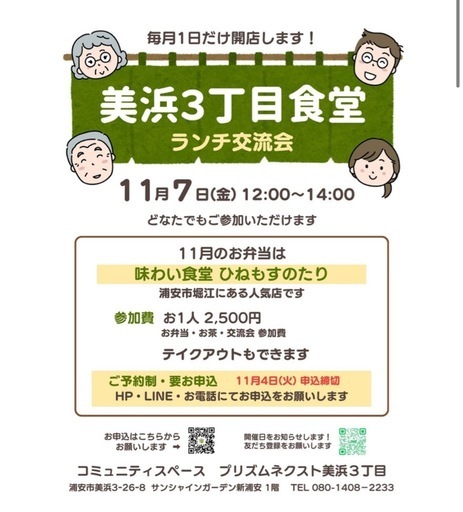 ランチ交流会を始めました✨ コミュニティ食堂 はじめました❣️❣️❣️ とはいえここにはキッチン設備もありませんしお食事の提供をすることは難しいのですが、、、 浦安市内にはおいしいお弁当を作ってくださるお店がたくさんある!と思うので✨ お弁当をテイクアウトして 毎月1日 だけの ランチ交流会 を開催します🍙※前回のお弁当内容は添付写真をご覧ください💓 ご夫婦で、親子で、ご友人と、もちろんおひとりでも、どなたでもご参加いただけます。 どんなところ? 見てみたいレンタルスペースって何?ここで何ができるの? というだけでなく 誰かとランチしたい🍴 ゆるっとおしゃべりしたい❣️ という方のご参加もお待ちしていま✨ ご参加いただくにはお申込が必要です⚠️以下のフォームよりお弁当のご予約をお願いします✨ お持ち帰りもできます👍 せっかくなのでここでは食べないけど、お持ち帰りしたいという方がいましたらご予約の上、お受け取りにお越しください!! 配達はしておりませんので営業時間中に、ここに取りに来てくださいね❣️ お弁当のご要望をいただけたらうれしいです! たった2時間ではありますが毎月、開催したいと思っています ここのお弁当が食べたい🍱このお店がおいしいよ😋 というご要望いただけますととってもうれしいですおススメのお店があればぜひ教えてください❣️ 浦安市内の飲食店さんからのご連絡もお待ちしています 11月のお弁当は‥ 味わい食堂 ひねもすのたり さん(浦安市堀江3-25-1) ひねもすのたり弁当 です※メンチカツが有名💓前回のお弁当にも入ってました❣️ 美浜3丁目食堂 ~おいしいごはんをご一緒に~ 日時2025年11月7日(金) 12:00~14:00場所 プリズムネクスト美浜3丁目参加費 店内 2,500円 (お弁当、お茶、おしゃべり会 参加費)テイクアウト 1,500円 (お弁当のみ)当日、現金にてお支払いください定員 店内 10名 ※先着順申込締切 2025年9月30日(火) ※定員になり次第締切お申込後、お申込締切日を過ぎてからのキャンセルはできません 店主 田頭あやこプリズムネクスト美浜3丁目 コミュニティマネージャー 主催 プリズムネクスト美浜3丁目お申し込みはこちら⬇️またはQRコードより(2枚目) https://www.prismnext.com/event/