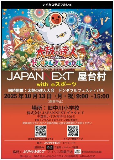 廃校になった小学校を社屋として活用しているディスプレイメーカーのJAPANNEXT本社グラウンドでeスポーツ大会を開催します。イベントページ https://fb.me/e/8pI7js1JR太鼓の達人ドンダフルフェスティバル参加無料大会参加者募集!エントリーはこちら! https://forms.gle/K4SEud8NQ7jD4dr9A当日参加申込みも可能です。優勝者には表彰状といすみのお米2位は表彰状と地元いすみの洋菓子屋さん、アイリス洋菓子のお菓子3位はJAPANNEXTオリジナル駅名板キーホルダー(いすみ鉄道上総中川駅)当日はマルシェも開催されます。奮ってご参加ください。