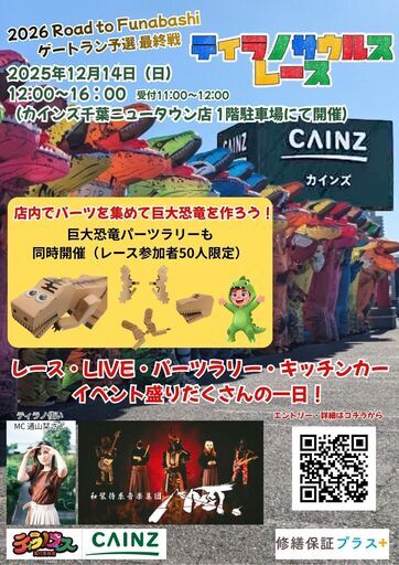 これが本当に最後の予選レース!あとは抽選のみ!来年2026年3月21日(土)に千葉県船橋市・船橋競馬場で開催される 「ティラノフェス vol.2」 に向けた、最終ゲートラン予選・第5戦が緊急開催決定!🦖 開催概要開催日:2025年12月14日(日)開催時間:12:00~16:30ごろ会場:カインズ千葉ニュータウン店(1階平面駐車場 特設エリア)募集数:200体※上位入賞者には、2026年3月21日「ティラノフェス vol.2」ゲートレース優先エントリー権を付与します。今回は、リニューアルオープンしたカインズ千葉ニュータウン店で、スケールアップした会場を舞台にティラノたちが疾走します!さらに、店内では“恐竜のクラフトフィギュアパーツラリー”も同時開催!ティラノサウルスレースとセットで楽しめる、ファミリーにもおすすめの内容です。ステージ・キッチンカーも出店し、1日中楽しめるイベントになっています。🦖 当日のスケジュール受付:11:00〜12:00(恐竜ゲートが目印!)開会式・ラジオ体操:12:15〜競技:12:20~15:30(予定)閉会式・Liveダンスタイム:15:45〜16:30※進行状況により時間が前後する場合があります。MC・運営の案内にご注意ください。🦖 競技内容ティラノサウルスレース・タイムトライアル(幼獣25m/成獣40m) → 成獣は決勝レースあり。上位入賞者にはゲートエントリー権を付与。ティラノさんの肉投げ(任意参加) 優勝者にはティラノフェスオリジナルキーホルダーをプレゼント! ※タイムトライアル参加者多数の場合は中止の可能性あり(返金不可)ティラノさんが転んだ(任意参加・1R~2R予定) 優勝者にはティラノフェスオリジナルキーホルダーをプレゼント! ※タイムトライアルレース参加者多数の場合は中止の可能性あり(返金不可)。クラフトフィギュアパーツラリー 恐竜パーツを集めて組み立てよう! 希望者限定50名(ティラノレース参加者限定・参加無料) ※空きがある場合は一般参加可。当日現金支払い1,500円で参加可能。🦖 ティラノサウルスレース参加費幼獣:1,000円成獣:2,000円※当日参加は+500円(現金のみ)※ティラノサウルススーツ持参必須(レンタルなし)※更衣室・クロークはありません。荷物は各自で管理してください。🦖 レース受付締切2025年12月13日(土)11:59まで🦖 出演情報MC:通山栞さん(ティラノ使い)出演アーティスト:和装侍系音楽集団 MYST.閉会式では、和装侍系音楽集団MYST.の迫力ある楽曲に合わせた「ダンスタイム」も開催!ティラノも観客も一緒に盛り上がろう!🦖 イベント中止について雨天決行。中止の判断は前日18時までにティラノフェス実行委員会の公式X(旧Twitter)にてお知らせします。👉 公式X(@t_rexkyougi)緊急事態宣言や大規模災害発生時も同様に案内いたします。🦖 大会規約・スーツ規定本大会は「日本ティラノサウルス競技連盟」の規定に基づきます。ティラノサウルススーツ持参必須。詳細はPeatixより確認ください。🦖 注意事項スーツのレンタルはありません。着回しは禁止です。スタッフの指示に従わない場合、参加取り消し・退場の可能性があります。会場内外での事故・盗難・紛失について、主催者は責任を負いません。ケガはイベント保険の範囲内で対応します。小学生以下は保護者同伴必須。酒気帯びでの参加禁止。ゴミは各自お持ち帰りください。撮影された映像・写真は公式HPやSNS等に使用される場合があります。掲載不可希望の方はスタッフへお申し出ください。肖像権はティラノフェス実行委員会に帰属します。自然災害・運営都合により内容変更・中止となる場合があります。申し込みはこちらから https://trexfes-cainzchibanewtown.peatix.com