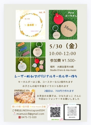 5月30日(金) ⭐️場所 大網白里市大網695 学生服取扱(株)なかだい敷地内 コインランドリー2F studio D'oro&mia music ⭐️ 時間 10時から12時 ⭐️参加費1500円 お茶とお菓子付レーザー彫刻機でオリジナルキーホルダーがつくれます。キーホルダーは1個、コースターなら2個つくれます。お子さんの絵や手描きイラストなども彫れます 講師 栗林 瑞希息子が生まれてからは保育士を目指し現在 平日は、療育施設の先生、週末は「てがたアート&レーザー彫刻のお店Mysaの店主をしております。キーホルダーは、プレゼントにと選んで頂き、とても喜ばれています。「今」を残す。世界に1つのキーホルダーをつくりましょう。