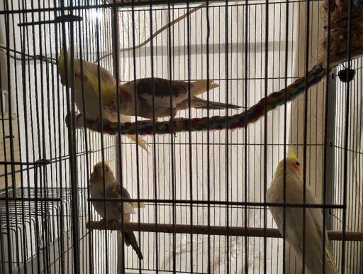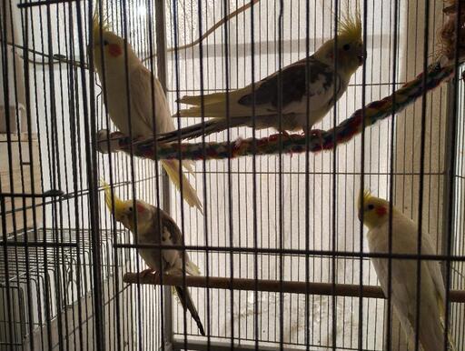 ◆性格や特徴オカメインコイエローは大人し目です。グレー色が入ってる子は少し活発です。イエロー、女の子かな?あまり鳴かないし、話しません。グレー色が入ってる子は、親の言葉を真似して「きなこ、こちょこちょ」を時々話します。(チイチイパッパ、ココおはよ…話すかも)親達は手乗りですが、子供達は違います。コザクラインコ手乗りでは有りません。噛みつき癖が有り、餌をあげるとき気を付けて下さい。無精卵を産んだので女の子です。近々、引っ越しを予定しているので、末永く可愛がって貰える里親を探しています。◆健康状態良好◆その他ゲージが狭いのと、時たま驚いて暴れるので尾羽が亂れてます。広めの少数飼いで生え変わるのを待って頂ければ良いかと思います。譲渡契約書を交わします。譲渡契約書はジモシーで閲覧出来るはずなので確認をお願いします。
