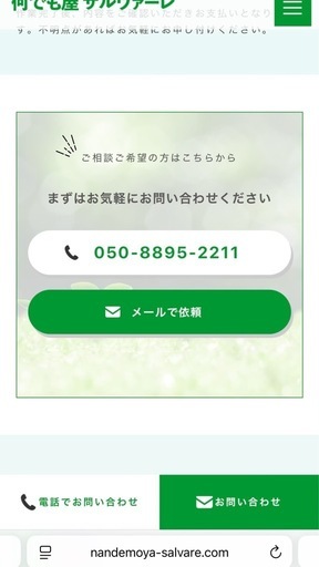 生活のお困りごとから近隣トラブルまで“安心・迅速”に解決!木更津市で「ちょっと困った…」を感じたら、地域密着の何でも屋サルヴァーレ にお任せください。サルヴァーレは、草刈り・不用品回収・買い物代行・荷物運びなどの一般的な便利屋作業から、近年依頼が急増している 近隣トラブル・騒音問題・ゴミトラブル対応・苦情代行・第三者介入サポート まで幅広く対応しています。⸻■ サルヴァーレが選ばれる理由✔ 地域密着の何でも屋(木更津市専門対応)木更津市内の地理・地域事情・住宅環境にも精通しており、「今すぐ来てほしい」の声にも可能な限り対応します。✔ 即日・緊急対応もOK急なトラブル、急ぎの作業にも柔軟に対応。夜間・休日の相談もお気軽にどうぞ。✔ 近隣トラブルへの第三者介入が得意・騒音トラブル・ゴミ問題・無断駐車・生活音の苦情代行・境界線問題・嫌がらせ相談など、当事者同士では言いづらい問題を中立的に解決します。「感情的にならず、丁寧に伝えてほしい」「角が立たない方法でお願いしたい」そんなご依頼に高い評価をいただいています。✔ 丁寧・誠実な対応依頼者とご近所の双方に配慮し、“揉めない伝え方・悪化させないコミュニケーション” を徹底しています。✔ 明朗会計で初めての方でも安心作業前に必ず料金を提示し、追加料金なし。地域で信頼される何でも屋を目指しています。⸻■ 対応サービス一覧(人気メニュー)▼ 近年依頼急増中 • 近隣トラブル対応(木更津市内全域対応) • 騒音トラブルの相談 • ゴミ問題の調整・相談 • 無断駐車トラブル対応 • 生活音の聞き取り・第三者介入 • 苦情代行・相談代行▼ 定番の便利屋サービス • 草刈り・庭木の剪定 • 不用品回収・片付け • 引っ越し手伝い・荷物運び • 家具移動・組み立て • 買い物代行・付き添い • 部屋の掃除・片付け • 高齢者サポート⸻■ 木更津市での最近の依頼例(一部)・アパートの生活音トラブル調整・隣家の落ち葉問題の相談・ゴミ置き場のルール違反対応・無断駐車の丁寧な注意・高齢者宅の庭の草刈り・引っ越しの荷物運び・買い物代行、付き添い・物置や家財の処分サポート地域での口コミ紹介からのリピート依頼が増えています。⸻■ 木更津市内の対応エリア木更津駅周辺/請西・請西東/太田/桜井・桜井新町/清見台/金田東/祇園/ほたる野/羽鳥野/潮見/港南台 ほか※君津市・袖ヶ浦市からの依頼も対応できます⸻■ このようなお悩みはサルヴァーレへ✓ 近隣トラブルを悪化させずに解決したい✓ 直接言うと角が立つので代わりに相談してほしい✓ 今日中に作業してほしい✓ 他社に断られた内容でも対応してほしい✓ 家庭・仕事の事情で自分で動けない木更津市でお困りごとがある方は、何でも屋サルヴァーレがあなたの代わりに動きます。ホームページURL https://nandemoya-salvare.com/是非お問い合わせ下さい