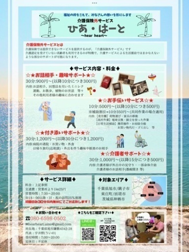 【初回のみ30分無料にてサービスのご提供ができます!】高齢者専門のお役立ちサービス〜介護保険では賄えない部分でお役立ち〜「傾聴」を通じて本当のお悩み事を確認し、「困ったなぁ」「不安だなぁ」を解決致します!はじめまして!千葉県の海匝地域周辺(旭市・銚子市・匝瑳市・東庄町・茨城県神栖市)を中心に高齢者向けの【保険外サービス】を展開している宇井野と申します。※感染対策(マスク・消毒・当日の検温)徹底してお伺いします【自己紹介】資格:高齢者傾聴スペシャリスト 取得 認知症介助士 取得 介護福祉士実務者研修(ヘルパー1級) 経験:人材サービスの営業職7年→介護老人保険施設にて介護職2年※人の話をしっかり聴くお仕事をずっと経験してきました。現在は高齢者施設で介護職の本業がある為、同時進行となってしまいますが、ゆくゆくは保険外サービス一本に絞って行く予定です。【お問い合わせ】介護保険外サービス「ひあ・はーと」電話:080-6598-0502メール:hearheart.uino@gmail.com↓↓Instagram↓↓ https://www.instagram.com/amimo0502↓↓サービス概要HP↓↓ https://peraichi.com/landing_pages/view/amimo0502keicho/※ジモティー以外からのご連絡を頂く場合は、「ジモティー見た」とお伝えください。【サービスの概要】利用者様(高齢者)のご自宅へ訪問し、主に「お話相手」やご要望に応じて「家事手伝い」「重い荷物運び」等、普段利用者様がご不便に思うような部分のお手伝いをさせていただきます。私がお伺いすることにより、利用者様の日常生活に少しでも希望を与えられたら幸いです。※お話相手の場合、ご自宅不可でしたら別の場所でも構いません。※介護保険適用外サービスとなりますので、ご注意ください※介護サービスとは異なりますので、医療行為や危険を伴う可能性がある介護業務はできません。【サービスの目的】☆利用者様の心のケアを担う役割になります。「傾聴」を通じて話を聴く事で、利用者様の気持ちをスッキリとさせることや、昔話等を回想しながらお話を伺うことで、利用者様の様々な感情に訴えかけ、より脳の活性化を図ることが可能です。☆日常生活や生活の質の向上に貢献していきます。「傾聴」を通じてお話を伺う中で見える日常生活の不安点なども、可能な範囲で解決していきます。【対象者】☆千葉県旭市・銚子市・匝瑳市・東庄町・茨城県神栖市にお住まいの方※上記以外にお住まいの方でも、場所にはよりますが遠慮なくご相談くださいませ。☆独居高齢者世帯☆老老介護世帯☆自宅介護世帯(レスパイトケアや一時的な外出を必要とされている方)【サービス料金】☆初回(1時間迄)に限り、基本料金0円にて提供させていただきます。サービス料金★お話相手・趣味サポート⇒30分:900円〜★お手伝いサービス⇒10分:500円〜※補助割引:350円〜(共同作業の場合)★付き添いサポート⇒30分:1,200円〜★介護者サポート⇒30分:1,000円〜★交通費旭市内の営業所より1km25円より※日・祝・18:00以降は通常の25%割増【訪問日時】本業の介護職の兼ね合いにより、本業が休日・夜勤前などの空いた時間のみでの対応となりますので、ご希望の日時で対応できずご迷惑おかけすることが多々あるかと思いますが、ご了承いただければ幸いです。