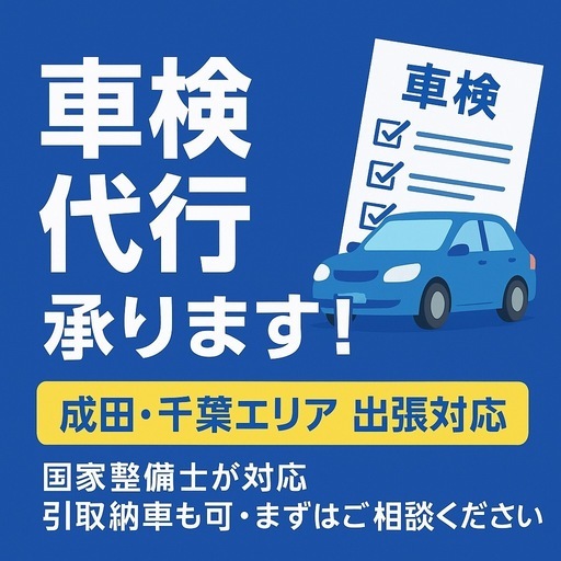 成田市を拠点に、千葉県内および近隣エリアにて 車検代行サービス を承っております!元ディーラー整備士が独立し、近年話題になっている完全出張型の車検サービスを始めました!経験豊富な二級整備士が責任をもって対応いたしますので、安心してご依頼ください。弊社では、出張でのサービスをメインとしておりこんなお客様にピッタリなサービスとなっております・少しでも安く車検を通したい!・この先長く乗らないから整備も必要最低限で済ませたい!・時間が無いから引き取りから納車までお願いしたい!まず車検の通る状態であることを事前点検し、車検に適合しないものに関しては事前に料金をしっかりとお伝えし、作業へ進みますお客様のご要望によっては代車の貸し出しも行っておりますので、ご相談下さい!ご利用料金車種、車検不適合部の整備費用その他オイル交換など追加整備のご依頼で金額の変動があります•軽自動車:総額 46,000円前後〜•普通車(1.0〜1.5t):総額 64,000円前後〜•普通車(1.5〜2.0t):総額 72,000円前後〜【サービスの流れ】 1. ご自宅や職場など、ご指定の場所までお車を引き取りに伺います。 2. 陸運局にて必要な手続きを行い、検査ラインを通して車検を代行。 3. 車検完了後は再びお客様のもとへ納車いたします。【当サービスの特徴】 • 国家資格を持つ整備士が対応 元ディーラーマン・二級整備士が責任をもって代行いたします。•引取納車に対応 車を持ち込む必要がなく、ご自宅や会社などご希望の場所で受け渡し可能。•地域密着で柔軟対応 成田周辺での豊富な経験を活かし、地域のお客様に寄り添ったきめ細やかなサービスをお届けします。•軽整備もご相談可 車検とあわせて、オイル交換やバッテリー交換などの簡易整備にも対応。•わかりやすいご案内 必要書類や準備物を事前に丁寧にご説明しますので、初めての方も安心です。【対応車種】軽自動車から普通車、ミニバンやSUVまで幅広く対応。法人様の社用車や複数台まとめてのご依頼も可能です。【ご利用にあたって】 • 車検証と自賠責保険証をご用意ください。 • ご希望日時や車両情報を事前にお知らせいただけるとスムーズです。 • エリアや車種により対応できない場合がございますので、まずはお気軽にご相談ください。地元成田を中心に、「安心・迅速・柔軟対応」 をモットーに丁寧なサービスを心がけております。車検代行をご検討中の方は、ぜひ一度お問い合わせください。