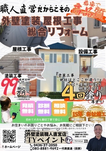 千葉県全域対応致します✨お客様のご要望に全力でお答えします✨定期的なメンテナンスを行う事により大切な財産を綺麗な状態に保てます✨下記の内容は弊社で承っております内容となります。まとめてご契約の場合お安くなりますのでお得です!・外壁塗装・屋根カバー・屋根葺き替え・サイディング交換 ・給湯器・エコキュート交換・外構・害虫駆除・樋交換・ユニットバス交換 など些細な事でもまずはご相談下さい♪♪ホームページ・Instagram 検査『TYペイント』現在年末キャンペーン実施中です。詳細は他の投稿又はお問い合わせ下さい。【1組様】※ご契約数に限りがありますので上限に達してしまった場合終了とさせて頂きます。
