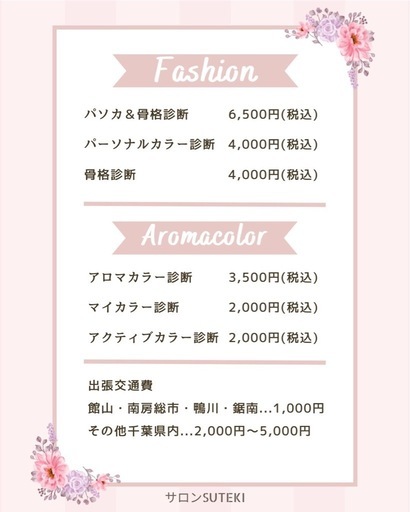 👗「似合う」を見つけて、毎日をもっと楽しく!プロの診断で、あなたの個性を輝かせる色とスタイルを徹底解説します。地元での活動をメインに、あなたの魅力を引き出すお手伝いをさせていただきます!🎨 サービス内容パーソナルカラー診断と骨格診断を組み合わせ、トータルで「本当に似合う」ファッションをご提案いたします * 特典: 診断結果をいつでも見返せるデータ形式のアドバイスシートでお渡しします。紙の紛失の心配がなく、スマホで気軽に活用できます!🏠 【限定5組】特別サロン枠のご案内「自宅サロンでじっくり受けたい」という地元のお客様の声にお応えし、毎月5組様限定の特別枠を設けています。 * 特別な体験: 落ち着いた空間で、時間をかけた丁寧なコンサルティングをご提供します。 * 出張診断との違い: サロン特別枠は、出張診断とは異なる料金設定(付加価値を含む)となります。🚙 出張診断も承ります!お客様のご指定の場所(ご自宅、レンタルスペースなど)へ伺います! * 診断料: サロン特別枠と同額です。 * 費用負担: 診断料の他に、交通費と会場使用料をご負担いただきます。📅 ご予約・お問い合わせ方法ご予約は、公式LINEよりお気軽にご連絡ください。<LINEへお送りいただく内容> * お名前 * ご希望のメニュー(サロン or 出張) * ご希望の日時(第3希望まで)🔻公式LINEはこちら https://lin.ee/uPr0Abt🔻Instagramはこちら https://www.instagram.com/suteki_style?igsh=YnozMzg0N3J2dDVv皆様とお会いできることを楽しみにしております