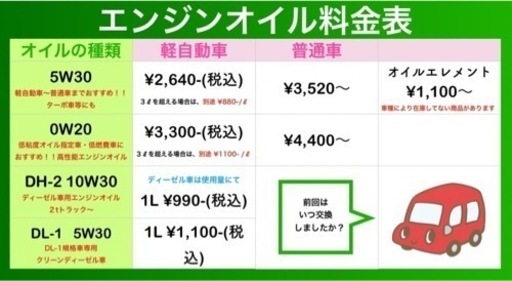 ご覧頂きありがとうございます!🚗エンジンオイル交換承ります🚗随時予約受付しておりますのでぜひお問い合わせ下さい。Middle Rank千葉県袖ヶ浦市林835営業時間9:00〜19:00(最終受付18:30)※外出している場合もございますのでご来店の際は事前にご連絡お願い致します。エンジンオイルの役割はよく人間に例えると、エンジンは「心臓」と言われています。そのエンジン内を循環するエンジンオイルは「血液」と言われています。エンジンオイルのコンディションを良い状態で維持することで、エンジンを長くベストな状態で保ちます。エンジンオイルはそれほど大切な部品なのです。当社では3000km又は6ヶ月毎の交換をおすすめしております!🚘当店指定オイル🚘⭐️5W30(部分合成油)軽自動車〜普通車までおすすめ!!ターボ車等にも。オールマイティオイル!✨軽自動車 2640円※3ℓを超える場合は、別途880円/ℓ✨普通車 3520円※4ℓを超える場合は、別途880円/ℓ⭐️0W20(全合成油)低粘度オイル指定車・低燃費車におすすめ!!高性能エンジンオイル。✨軽自動車 3300円※3ℓを超える場合は、別途1100円/ℓ✨普通車 4400円※4ℓを超える場合は、別途1100円/ℓ🌟DL-1 5W30DL-1規格車専用クリーンディーゼル車用1L 1100円〜🚗オイルエレメント 1100円〜※在庫してない車種もございますのでお問い合わせ下さい。☆簡易エンジンフラッシング 4400円〜エンジンオイルラインに溜まったスラッジやワニスを分解・除去します。交換前のエンジンオイルに添加して10分間アイドリングするだけで洗浄が出来て施工が簡単です。※フラッシング施工時は、エンジンオイルとオイルフィルターは同時交換になります。⭐️エンジンオイル交換工賃はサービス⭐️オイルエレメント交換は別途工賃かかります。お客様によるエンジンオイルやオイルエレメント持込での交換作業もご対応可能です!その際は別途工賃頂きます。まずは一度お気軽にご相談下さい!※作業は国産車に限ります。出張での作業も対応しております。上記料金より別途出張費いただきます。☆クレジットカード決済も可能です☆公式LINE開設致しましたので下記からもご予約受け付けております!【公式LINE】 https://page.line.me/126uwnep