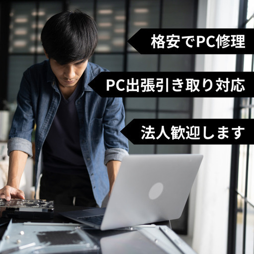 ご覧いただきありがとうございます。個人事業主として、年間200台以上のパソコン作成・修理を行っております。個人の強みを活かし、小回りの利く柔軟な対応と格安価格でお受けいたします!お見積りは法人・個人問わず【無料】ですので、パソコン周りのお悩みはお気軽にご相談ください。■□■ 対応サービス一覧 ■□■【1】パソコン修理・スペックアップ・データ救出デスクトップPC、ノートPCどちらも対応可能です。「電源が入らない」「動きが遅い」といったトラブル解決から、「メモリやSSDを増設したい」などのカスタムも大歓迎です。また、起動しなくなったPCからの「データ救出」や、新しいPCへの「データ移行」のみのご依頼も承ります。【2】不要PC・周辺機器の買取・下取り修理の際、ご自宅にある不要なPCや周辺機器を下取りに出していただくことで、修理代金からお値引きが可能です!パソコン本体だけでなく、使わなくなったモニター、キーボード、PCパーツ単体(グラボやメモリ等)、ケーブル類のみの買取・無料引き取りも大歓迎です。壊れていても(ジャンク品でも)一度ご相談ください。【3】パソコン処分・完全データ消去不要になったパソコンの処分・廃棄も承ります。処分時には、すべてのPCに対して「アメリカ国家安全保障局(NSA)推奨方式」での完全データ消去を実行いたしますので、個人情報や機密データ漏洩の心配はございません。【4】オリジナルPC作成・買い替えサポート用途やご予算に合わせたオリジナルPC(BTO)の作成、フルセット販売も行っております。「修理費用が高額になってしまう」「古すぎて直らない」といった場合は、当店作成の格安PCや中古再生PCへの買い替えもご提案可能です。面倒な初期設定や古いPCからのデータ移行も格安で行います。【5】法人・SOHO様向けITサポート専任のIT担当者がいない小規模な会社様・事務所様の「外部IT相談窓口(かかりつけ医)」としてもご利用ください。普段のPCトラブル対応から、従業員増員時のPC一括導入などもサポートいたします。また、オフィス移転、閉店、事業縮小に伴うPCや周辺機器の「一括買取・処分・データ消去」も対応可能です。■□■ お取引の大まかな流れ ■□■① お見積り依頼(ジモティーのメッセージよりご連絡ください)② おおまかな納期と概算お見積りをご提示③ お見積りOKの場合、PCをお預かり④ 修理・作業の実施⑤ 完了後、お渡し・ご精算※基本的には一度お預かりしての対応とさせていただいております。■□■ お問い合わせ時のお願い ■□■スムーズなお見積りのため、分かる範囲で構いませんので以下の情報をお知らせください。・パソコンのメーカー、型番(または自作PC)・現在の症状、またはご希望の作業内容・(下取りや買取がある場合)品物の詳細「こんなことでも頼めるかな?」といったご相談でも全く問題ありません。皆様からのご連絡を心よりお待ちしております!