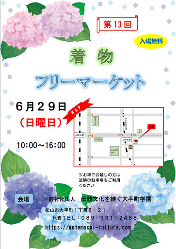 開催日:6月29日(日)10:00~16:00(搬入時間は当日9:00~となります)出店の品物は、着物に関する物でしたら何でもOKです。お家に眠っているお着物や帯、小物などありましたら、一緒に出店されてみませんか? ・着物 ・帯 ・浴衣 ・着付小物 ・着物や帯から作った服やバッグや小物類等 ・リメイク用着物や反物、端切れ等 出店料・・・W1800×D450サイズの机 1,000円/個