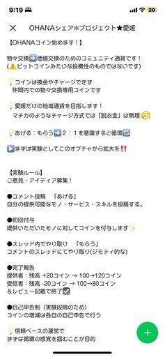 🔶選べる物々交換会 開催 日時:希望日お寄せください 場所:味酒⬇️オンラインメンバー募集!新企画!【OHANAコイン始めます!】物々交換➡️価値交換のためのコミュニティ通貨です!💡コインは換金やチャージできず 仲間内での物々交換専用コインですマチカのようなチャージ方式ではなく💡愛媛だけの地域通貨を目指します!【実験ルール】ご意見・アイディア募集!●あげる自分の提供可能なモノ・サービス・スキルを投稿する。余剰なもので大丈夫🙆♀️●もらうスレッド内やり取り(ジモティ的な)オープンチャット「OHANAシェア❇︎プロジェクト★愛媛」 https://line.me/ti/g2/mYaTcXbtKn2WFAAAY09vy4sDh9AoXGKvsavFCQ?utm_source=invitation&utm_medium=link_copy&utm_campaign=default是非コミュニティ活性化、循環🔄スタートにご協力お願いします🙏