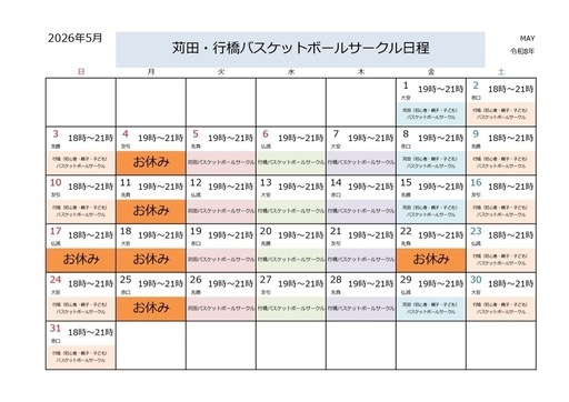 苅田(親子)バスケットボールサークルは5月1日(金)19時から21時、苅田町立南原小学校の体育館です。