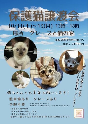 子猫、成猫、人馴れ抜群な可愛い保護猫たちが勢揃いです😺♥️ゴロスリの猫ちゃんたちに会いに来てください!優しい里親さんとの出会いがありますように😻♥️猫ちゃんたちの命を守るため、ご寄付をお願いしております😺💖皆様のご支援は猫ちゃんたちの保護、不妊去勢手術、医療費に使わせていただきます😺予約不要🍀☺️🍀靴下の着用をお願いいたします🧦駐車場有り🅿️🚗クレープあり🍇🍎