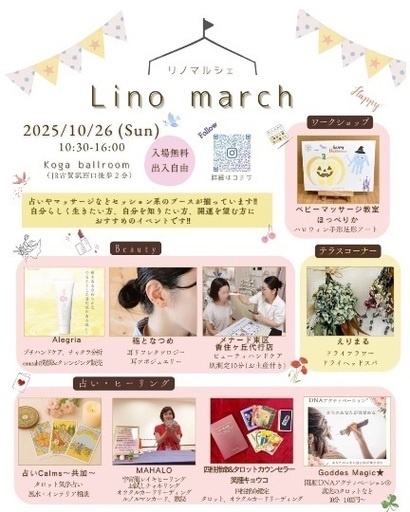✨出店者さまご紹介✨\10月26日(日) Linomarché 開催/今回で7回目となるLino marché🕊️JR古賀駅西口徒歩2分 『koga ballroom』にて開催✨占いやヒーリングのセッション系や女性に嬉しいBeautyブース、ワークショップのブースもあります❣️みなさまのお越しをお待ちしています🕊️✨✽.。.:*・゚ ✽.。.:*・゚ ✽.。.:*・゚ ✽.。.:*・゚ 出店者さまのご紹介✽.。.:*・゚ ✽.。.:*・゚ ✽.。.:*・゚ ✽.。.:*・゚《テラスブース》💐えりまる さま(ご出店内容)ドライフラワー 300円〜ドライヘッドスパ 10分1,000円/20分 2,000円@erimaru392 《ワークショップ》💐ベビーマッサージ教室 ほっぺりか さま(ご出店内容)ハロウィン手形足形アート@babytouch_hopperika 《Beauty》💐Algeria さま(ご出店内容)プチハンドケアenmusubi洗顔&クレンジング販売チャクラ分析@alegria.amar88 💐稲となつめ さま(ご出店内容)耳リフレクソロジー耳ツボジュエリー@ineto_natume 💐メナード東区香住ヶ丘代行店 さま(ご出店内容)ビューティハンドケア10分(お土産付き)500円肌測定10分(お土産付き)500円《占い・ヒーリング》💐占いCalms〜共加〜 さま(ご出店内容)タロット気学占い風水・インテリア相談@calmslotus 💐MAHALO さま(ご出店内容)宇宙龍レイキヒーリングお試しチャネリングオラクルカードリーディングルノルマンカード数秘@mahalo.004 💐四柱推命&タロットカウンセラー 笑理キョウコ さま(ご出店内容)四柱推命鑑定タロットオラクルカードリーディング@emiri.kyoko 💐Goddess Magic★(ご出店内容)開運!DNAアクティベーション®︎真実のタロットエンソフィックレイキ@yoshimi_33_si @kazumi_radiance13 ✽.。.:*・゚ ✽.。.:*・゚ ✽.。.:*・゚ ✽.。.:*・゚ ✽.。.:*・゚💐日時 2025年10月26日(日) 10:30〜16:00💐会場 koga ballroom💐アクセス JR古賀駅西口徒歩2分💐住所 福岡県古賀市天神1-9-7*会場前には駐車場がございませんので、お近くのパーキングをご利用くださいませ✽.。.:*・゚ ✽.。.:*・゚ ✽.。.:*・゚ ✽.。.:*・゚ ✽.。.:*・゚【Lino marché のコンセプト🌻】"Lino(リノ)“はハワイ語で「光る」「輝く」「奇跡」このマルシェに関わる全ての方が「今」輝くために、開催しています出店者のみなさまとご来場を心よりお待ちしています🕊️✨✽.。.:*・゚ ✽.。.:*・゚ ✽.。.:*・゚ ✽.。.:*・゚ ✽.。.:*・゚#リノマルシェ #マルシェ #イベント #占い #ピーリング #ドライフラワー #古賀市