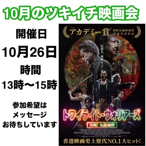 10月のツキイチ映画会のご案内です!10月26日(日曜)13時〜会費はありませんが映画会終了ワンドリンク注文をよろしくお願いします。今回のお題は「トワイライトウォーリアーズ」都合により変更もあるかもしれません。
