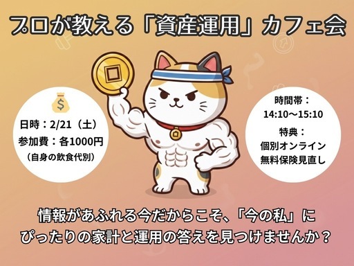 【2/21(土)14:10〜】将来の不安を安心に‼️プロが教える「資産運用」カフェ会(NOMIMAIカフェ会)☕️「新NISA、何が正解?」「今の保険、無駄じゃない?」情報があふれる今だからこそ、「今の私」にぴったりの家計と運用の答えを、薬剤師×FPの野見山真衣(のみまい)と一緒に見つけませんか?🎁 このカフェ会参加者だけの「特別ギフト」【プロが本気で診断!後日じっくり「個別オンライン無料保険見直し」】後日、Zoomでのマンツーマン無料相談をプレゼントします❣️FPの視点から、今の保険が本当に必要か、もっと良い選択肢はないかを客観的にアドバイスいたします。※希望者のみ。強引な勧誘は一切ありませんのでご安心ください!🌟 こんな方におすすめ・難しい勉強は苦手だけど、将来の不安をなくしたい方・保険や家計のムダをプロに診断してほしい方・資産運用の「第一歩」を中立な立場から聞きたい方・のみまいの「変額保険での失敗談」を聞いてみたい方📅 イベント詳細日時:2/21(土)14:10〜15:10場所:グランドミラージュ参加費:1,000円+ご自身の飲食代💬 のみまいより「知識ゼロで失敗も経験した私だからこそ、あなたの不安に寄り添い、一番の近道をお伝えできます。お茶を飲むような気軽な気持ちで遊びに来てくださいね!」🔻お申し込み(1分で完了)参加希望の方はメッセージください^ ^