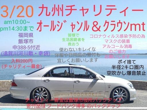 3月20日(日)九州チャリティーオールジャンル&クラウンMT日時R4/03/2010:30〜14:30場所福岡県 飯塚市 中388-5付近(遠賀川河川敷・幸袋)自由参加、自由解散主催許可役所/許可済警察/許可済今回は‼️生活困窮者を助けるチャリティーMTとなりますチャリティー内容入料場(募金)1台200円生活困窮者の支援の為に飯塚市役所 全額寄贈します‼️日用品=食材、洗剤、まだまだ使える日用品など洋服=男性、女性、子供、幼児、靴など(綺麗で まだ使える物や服)任意団体フードバンク博多と子ども食堂 バリバリキッチンに寄贈します‼️お願いと注意‼️You Tubeチャンネルにて今後の内容を配信予定なので・RSライダー チャンネル・せいくんねっとわ〜く チャンネル・西ちゃんぶらり旅 チャンネルのチャンネル登録宜しくお願いします🙇こまめに入場の流れなどを配信予定です‼️スムーズかつ迅速に入場が出来る様に‼️今後の配信を欠かさず見てね😍CARTUNEjunStyle アスリートさんの撮影会も有るよ 😁フォロー宜しく👍この度のコロナウィルス感染症の予防の為‼️入り口にて1台づつ、・マスクの確認をさせて頂きます🙇なお拒否された方は、入場出来ませんのでご理解お願いします🙇半径2キロ圏内での空ぶかし・爆音・ポイ捨てなど、絶対に止めて下さい、主催地ではマフラー変えてる方/オーディオされてる方はエンジンOFFでお願いします.付近の迷惑になります‼️館内は20キロ以下での徐行でお願いします🙇子供や歩行者が、居ますので気を付けて下さい‼️もし以下の事を、した方は車ごと川に沈めます‼️ご了承下さい🙇‼️雨の時は中止ですご了承下さい‼️😂この集まりはイベントではありませんミーティングですなので間違えない様にしてください😂じゃんけん大会きぐるみも来ますので家族で参加しても楽しめますのでぜひぜひ参加🙇お願いします‼️入場料金は1台200円です‼️200円は今回の生活困窮者を助けるチャリティー募金の費用にしますので宜しくお願いします‼️ご協力を宜しくお願いします🙇お詫びお客様と接するスタッフにはマスクの着用を義務付けています🙇不快に思われる方も居るとは思いますが、スタッフの健康第一に考え着用をさせて頂きます。ご了承下さい🙇出店タコ八(軽食)スバルン(着ぐるみ)ユーキDIYショップ…協賛任意団体フードバンク博多飯塚市役所、生活支援