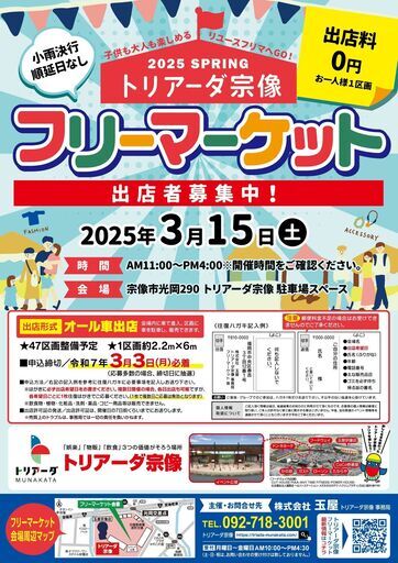宗像市光岡にてトリアーダ宗像でのフリーマーケットの開催が決定しましたので、宜しくお願い申し上げます。開催日:2025年3月15日(土)11:00~16:00※荒天中止、順延なし会場:〒811-3414 福岡県宗像市光岡290 トリアーダ宗像駐車場スペース申込方法:往復ハガキに必要事項記入の上、お送りください。●往信面おもて(送り先)〒810-0003福岡市中央区春吉3丁目12番1号㈱玉屋 トリアーダ宗像事務局 フリーマーケット係 宛●往信面うら・会場名(トリアーダ宗像)・氏名(要フリガナ)・年齢・電話番号・主な販売品目・ゴミを必ず持ち帰る旨の署名・「ジモティーを見て」とご記入ください●返信面おもて返信先となるお申込者様のご住所・お名前をご記入ください●返信面うら何も記入しないでください※抽選結果(当選の場合は出店許可証)を印刷して返送致します。出店料:無料応募締切:2025年3月3日(月)必着※応募多数の場合は抽選となります区画数:47区画予定(約2.2×6.0m)・オール車出店※上記区画内に車を駐車した上で、駐車した車以外の部分が出店スペースとなります※手持ちのみはお断りしています。必ず車での出店をお願いします。備考:※1区画につき、はがき1枚でのご応募となります。1グループ・1家族でのご参加は、1区画でのご応募をお願い致します。※必要事項記入漏れのある場合はご応募をお受けできません。※出店場所の指定はできません。※飲食物、動植物、薬品、化粧品、合成洗剤、コピー商品、各種権利、作動しないもの、不道徳なもの、会場内で他出店者から購入したもの などの販売は禁止です。※区画内に駐車した車は、終了時間まで移動はできません。※売買に関するトラブルは事務局では一切の責任を負いかねます。【お問い合わせ先】㈱玉屋 フリーマーケット係TEL)092-718-3001受付時間 (月)~(金)AM9:30~PM4:30※上記時間以外のお問い合わせはご遠慮ください以上宜しくお願い申し上げます。 https://www.triada-munakata.com/event.html