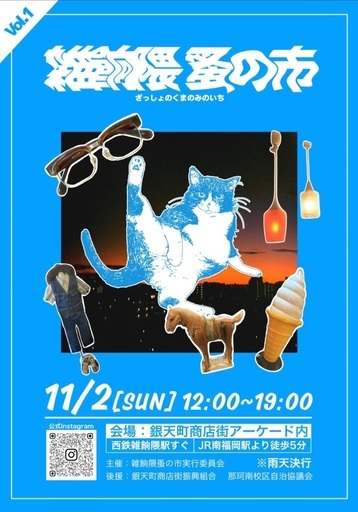 西鉄雑餉隈駅前の銀天町商店街アーケード内にて、初の「雑餉隈蚤の市」を開催します。古着や古本、アンティーク雑貨など個性豊かな店舗が集まり、商店街を彩ります。当日はキッチンカーや飲食ブースも登場し、大人から子どもまで楽しめる賑やかな一日となります。商店街の新たな魅力を体感できるこの機会に、ぜひご来場ください。 日時:令和7年11月2日(日曜日)12時00分〜19時00分場所:銀天町商店街(西鉄雑餉隈駅前、JR南福岡駅徒歩5分)