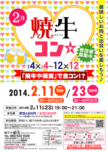 お申し込みは、下記ホームページからお願いいたします!! http://www.kitakyu-eight.com/紺屋町の隠れ家的空間で美味しいお肉を食べながら合コン♪♪婚活♪恋活♪友活♪こちらの合コンは、仲良くなりやすい少人数での合コンです。大人数のパーティーが苦手な方や、交流重視でお話されたい方にオススメのイベントです。また、ちょっと贅沢な、こだわりのお肉が堪能できます♪七輪で焼く焼肉は格別です!!○開催時間19:00~21:00(18:50分~受付) ○参加費男性4800円/女性3800円(コース料理+飲み放題)焼牛コンでは、グルメも素敵な出逢いもお楽しみいただけます♪落ち着いて色々な人と話したい そんな人に1番オススメする合コンです。是非、お気軽にご参加ください♪ご参加お待ちしております。