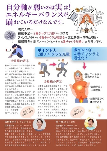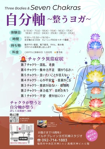 自分軸 整うヨガ 人に振り回されない、自分らしい生き方内容 : 自分軸をチェック!!⭐︎自分軸とは!20分、体験トレーニング80分+オーラ撮影開催日: 3/7(土)、3/10(火)、3/11(水) 3/14(土)、3/17(火)、3/18(水) 3/21(土)、3/24(火)、3/25(水) 3/28(土)、3/31(火)⭐︎上記以外の日程はお問合せください。 時間:9:50〜/ 13:50〜 / 18:50〜(月曜定休日) 会場名:イルチブレインヨガ天神スタジオ 会場住所:福岡市中央区天神3−4−2高橋天神ビル6F 参加費:1,000円 問合せ電話:092−714−1883スタジオLINE: https://lin.ee/yasp0ZT体験を希望される方は、希望の日にちと電話番号をお伝えくださいね😊