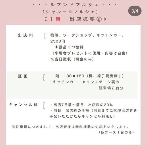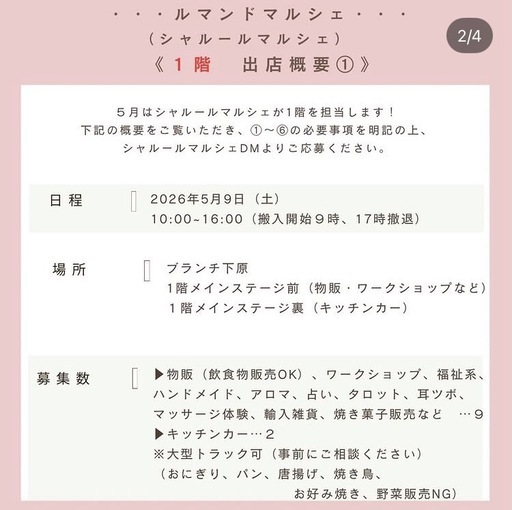 詳細をご覧になりお問い合わせはInstagram @chaleur_marche#シャルールマルシェまでお願いします。「ジモティをみました」とお問い合わせされるとスムーズですキッチンカーも同時募集中!